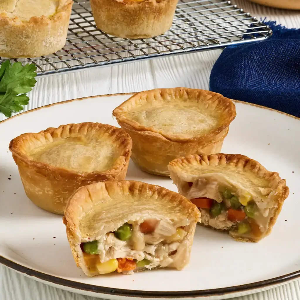 4. Roll out the pie crusts. Cut twelve 6-inch circles from the crust. Using your fingers shape crust circles into six 6-inch oven-safe souffle ramekins. Spoon filling into each ramekin. Cut a small hole in the center of each remaining dough circle and then cover each pie, crimping edges. Bake 20 minutes. Then cover edges of each pie with mini pie crust shields to protect crust from burning. Bake another 20-25 mins more until bubbly and crust is browned.