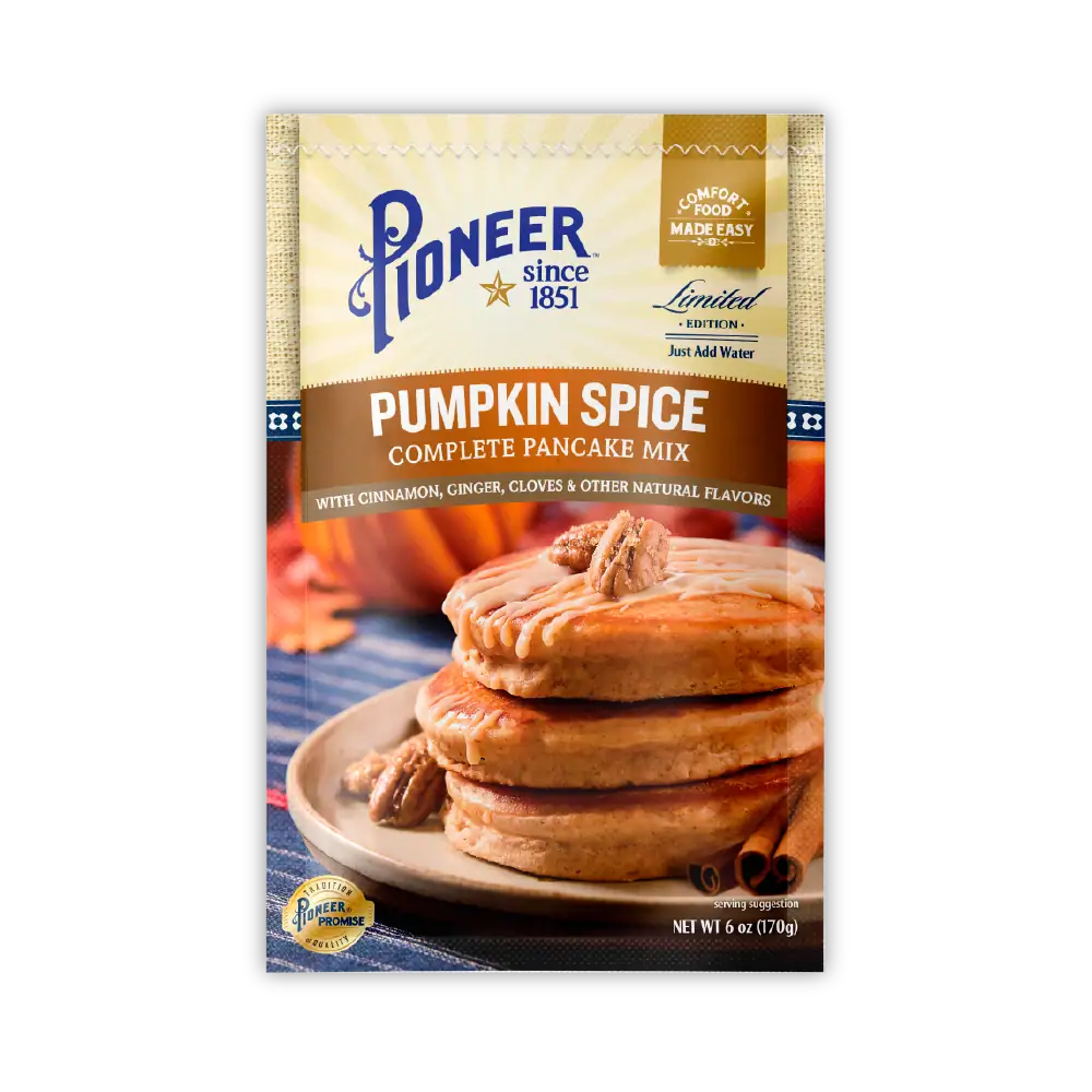 Indulge in the warm flavors and the beloved spices of fall with Pioneer Pumpkin Spice Pancake Mix. These festive, expertly crafted pancakes are easy to make and sure to impress. A few minutes is all it takes to serve a breakfast that fills bellies with the joy of a thankful and heart-warming season.